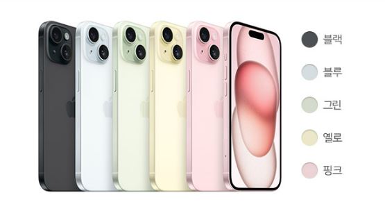 아이폰 15 색상은 블랙, 블루, 그린, 옐로우, 핑크가 있습니다.