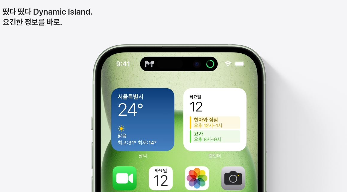 아이폰 14에서 프로에만 해당되던 다이나믹 아일랜드 기능이 아이폰 15 모든 시리즈에 추가 되었습니다. 이 기능은 각종 알림과 실시간 현황 정보를 띄워주어 사용자가 놓치지 않고 한눈에 확인 할 수 있도록 도와줍니다.